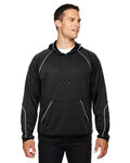 100% polyester brushed back fleece, 7.4 oz./yd2/250 gsm; Moisture wicking performance; Drawcord hood with metal cord ends; Spandex enhanced matching rib cuffs and waistband; Front hand warmer pouch pocket; Coverstitch details at hood, raglan, sleeves and pocket opening;